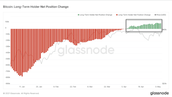 The long-term HODLer net position change, which measures the 30-day change in supply held by long-term bitcoin holders, recently flipped positive, and the data from Glassnode shows that over the last 30 days, HODLers have accumulated 93,638 BTC more than they have sold. This shows that the conviction of bitcoiners is not the least bit shaken in regards to the choppy price action, and they are viewing the period of consolidation as a buying opportunity.