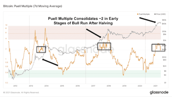 Obviously, the market value of new bitcoin issued greatly increases in a bull market, and this can be seen not only during the recent run up but also past bull market cycles following the halving. Currently, the Puell Multiple is at 2.5, following the healthy 75-day consolidation. When compared to previous bull markets, a similar pattern occurred around the $100 mark in 2012 and the $3,000 to $4,000 level during 2017.