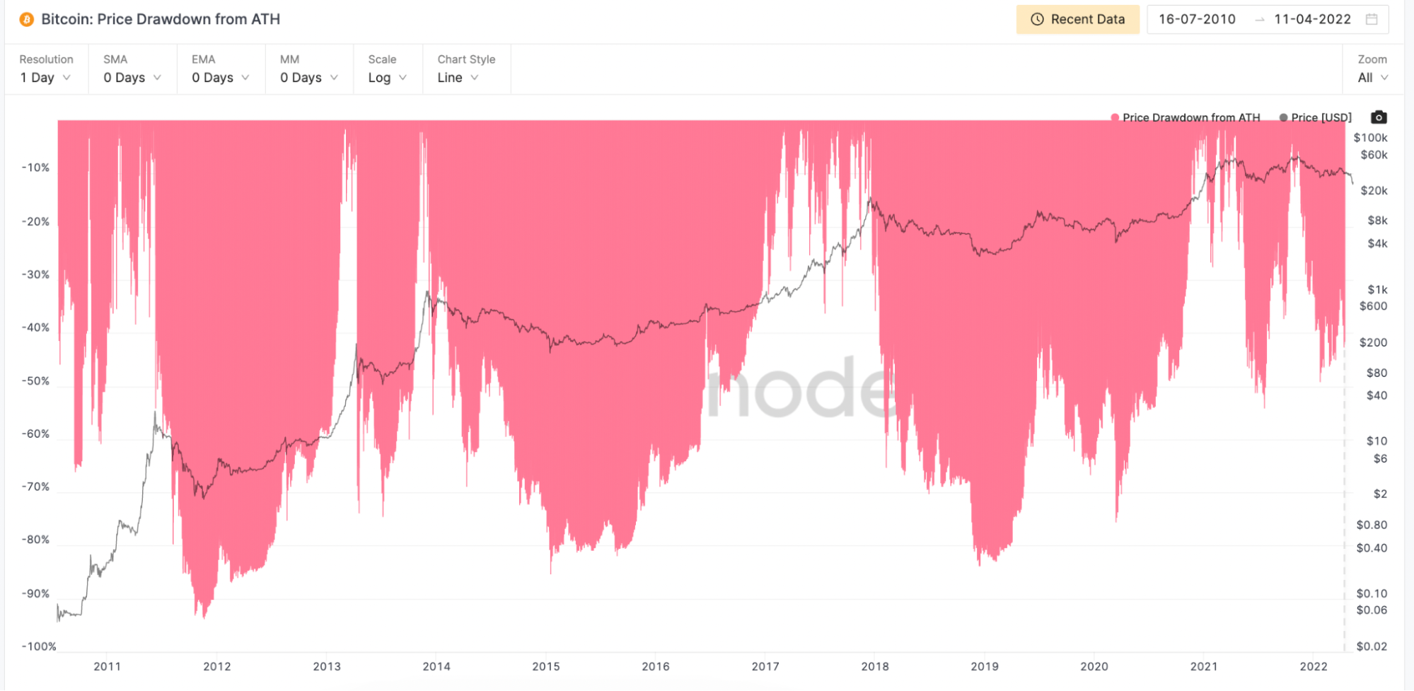 Recent years have seen shorter, smaller rallies and shorter, smaller drawdowns. This chart suggests that 50% drawdowns are the new normal, instead of 85%.