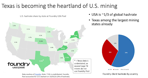 Data from Foundry USA, one of the largest mining pools in the world with 9-10% of hash rate, shows the United States has nearly a third of global hash rate with New York, Texas, Kentucky and Georgia amongst the top mining states in their mining pool. Foundry’s latest data, presented by Nic Carter and Castle Island Ventures at the Texas Blockchain Summit, roughly estimates a doubling in U.S. hash rate using the Cambridge Bitcoin Electricity Consumption Index’s data from April 2021. Although these are different data estimates and reference points, they give us a rough idea of the U.S. hash rate picture.