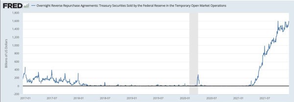 Then we quickly look at the Federal Reserve’s reverse repo total that is spiking once again to new highs at $1.6 trillion. This represents banks, money market funds or primary dealers lending the Fed money and getting U.S. treasuries (USTs) as collateral. It shows a general collateral shortage in the global plumbing and risk avoidance. It is also interesting that this is happening as the Japanese market is facing very similar issues. We’ll keep an eye on it and report more in the future.