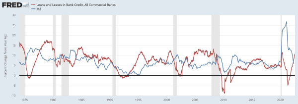 The chart below shows a measure of bank lending compared to M2. While the two have a positive correlation, it does not always hold, as is glaringly evident in 2020. So even though M2 was surging higher post-pandemic, banks were not lending due to uncertain economic conditions. As far as inflation is concerned, there is the added complexity of what banks are lending for, i.e., whether those loans are being used for productive ends, which would increase economic output or unproductive ends, which would end up leading to (asset) inflation. This decision is not driven by the government, but by the private sector.