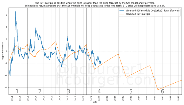 The popular Twitter handle s2fmultiple tracks how the price is performing compared to the S2F forecasts. The metric is referred to as the S2F multiple. A multiple greater than 0 means that the price is higher than the S2F multiple, and vice versa.