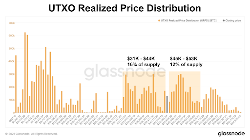 Each bar in the charts shows the amount of existing bitcoin that last moved within that price range. For bitcoin to drop below $40,000, we would have to see a significant sell-off in the market with many short-term investors realizing losses alongside a bigger structural change to long-term holders that accumulated in that 19.4% supply middle range.