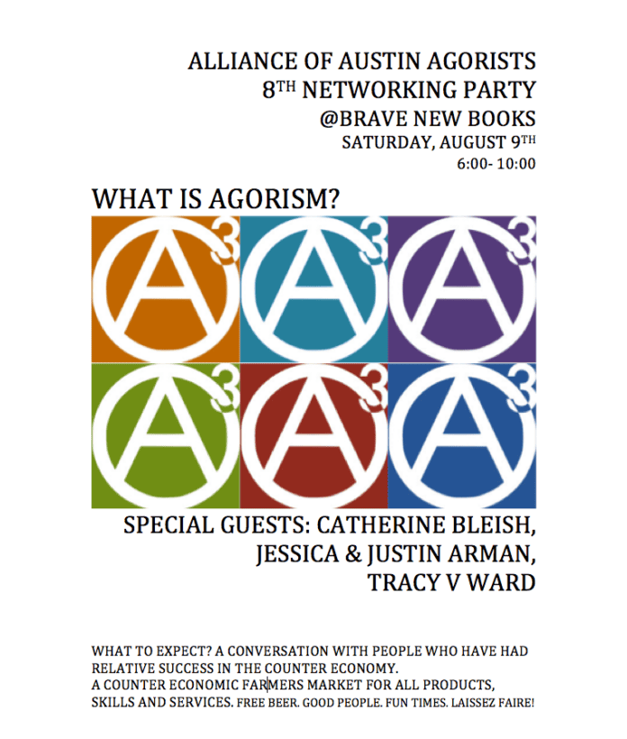 Join the Alliance of Austin Agorists this Saturday August 9th from 6 to 10pm at Brave New Books in Austin, Texas for their 8th networking party and counter-economic farmers market. They will host four Central Texas residents who have found success with enterprising agorist ventures.