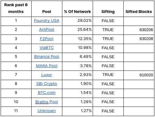 Based on the information above we can examine blocks found by pools to see if pools are actively sifting blocks. What we see is 44% of the network is or has sifted for sats in the past year. We have reason to believe that additional pools are in discussions with sifting technology developers in deploying the tech on their pools, but nothing has been made public at this time. Our findings reveal that a very significant percentage of the mining network sees value in sifting for these sats, otherwise this would be a hobbyist endeavor. When this many big players are participating, you know there is some market dynamics happening.