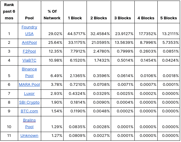 We know more than 40% of hashrate is sifting for sats, but what does that really mean in the grand scheme of things. Afterall, we are talking about one specific sat, the epic sat in block 840,000. We know that Ordinals have value according to the very small market, we also know that this sat will likely be sold for more than a single blocks reward, but the big question is who could forcibly win this block? Proof of Work is all about the longest chain and ethics don’t matter when it comes to Bitcoin and the blockchain. The chain is truth, even if you were to reorg. If you are hashing and following consensus and you build a longer chain then you are the victor. Based on the table from the previous section, we can see who the top pools are from the past six months. With that information we can model the probability of these pools forking and causing a reorg of the blockchain in order to win the epic sat but we need to run the numbers. For this we will explore the mining section of the Bitcoin Whitepaper.