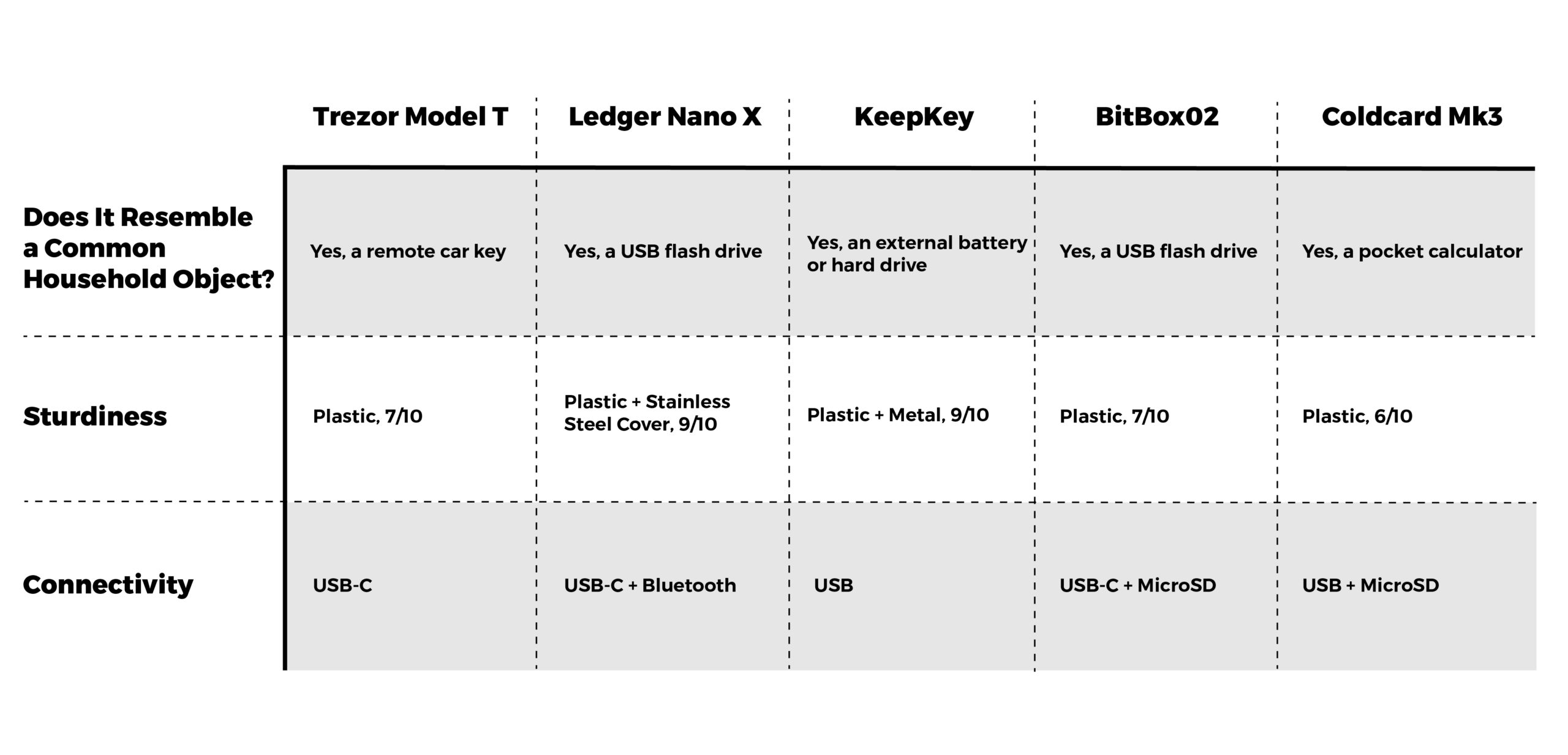 The first installment in this review will focus exclusively on the physical safety of hardware wallets. Beyond being devices with strong cryptographic encryption, hardware wallets are objects that require sturdiness, connectivity and, ideally, the ability to remain unnoticed in a drawer full of electronics. Security in hardware wallets isn’t just about the software but also the ability to pass border checks without raising suspicions and dropping your device on hard surfaces without causing serious damage.