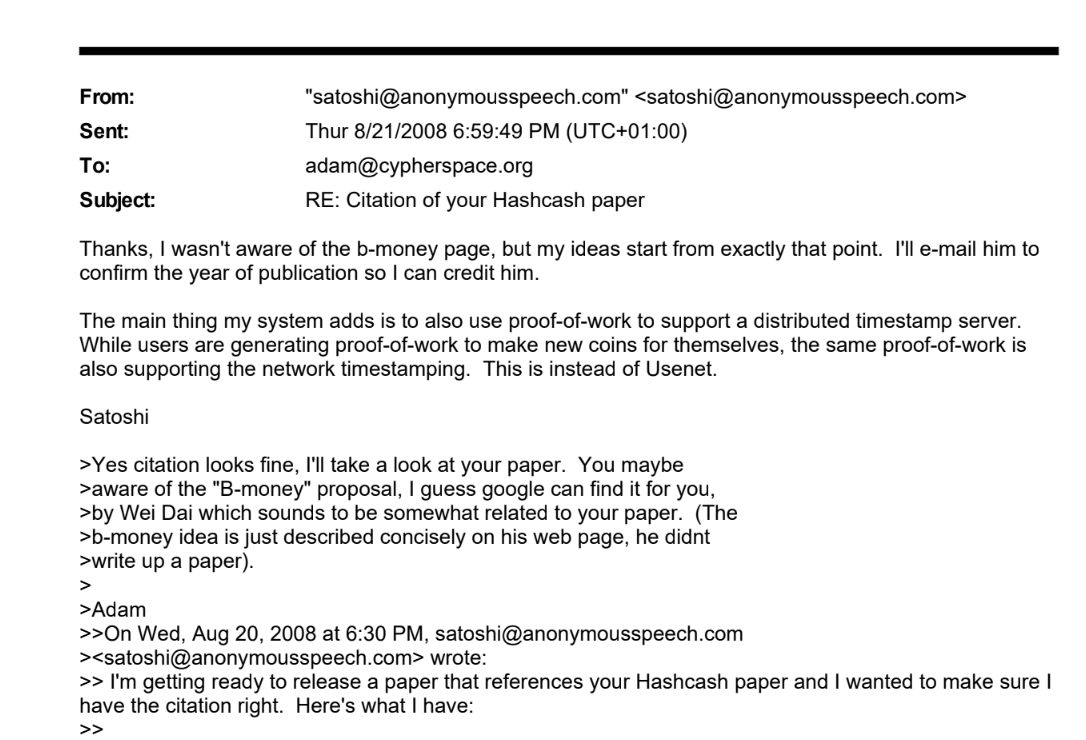 As detailed, the correspondence between the two was polite and professional, with Back pointing Satoshi to a few related papers, and Satoshi seeking to make clear the unique contributions he added to Back’s prior work.