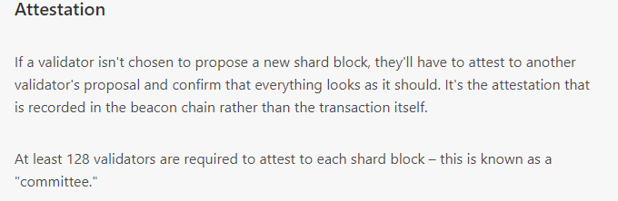 “An attestation is a validator’s vote, weighted by the validator’s balance,” it explains. “Attestations are broadcasted by validators in addition to blocks.”