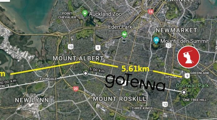 Working in Auckland, New Zealand, Walshe used Google Maps to devise a relay route that would respect goTenna’s stated maximum relay range of 6.4 km (though he notes this region is mountainous, so it was important to find high ground so as to not have any land structures interfere with the signals).
