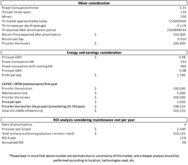 For an installation comprising 100 miners, the total CAPEX investment for the entire facility (including land for one container, MEP infrastructure, and miners) is estimated at around $503,000. The following analysis illustrates the approximate ROI over the next four years (until the next halving) for a facility operating 100 miners, each consuming 3.3 kW and with a price per kilowatt hour equal to 0.08$. To try to make it more accurate, this analysis assumes the hashrate increases by 50% annually, and uses traditional air cooling solutions. The projected future Bitcoin price used in this analysis is $250,000, based on various studies and speculations.