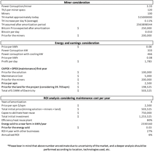 Upon initial analysis, the business model appears to be viable. The integration of a heat reuse side business has effectively doubled the return on investment (ROI). It is important to note that the ROI calculation is based on a four-year period, coinciding with the next Bitcoin halving event. While the facilities may no longer be optimal for the same cryptocurrency operations post-halving, the infrastructure will remain valuable for selling the generated heat.