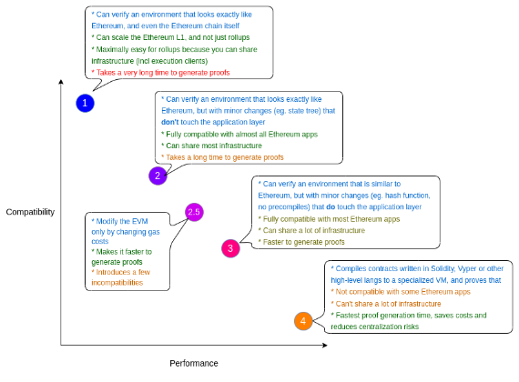 All zkEVMs operate using the same core principles, but they differ based on their level of compatibility with Ethereum. It turns out that higher compatibility is achieved at the expense of performance, and this happens because Ethereum wasn’t originally designed with zero-knowledge technology in mind.