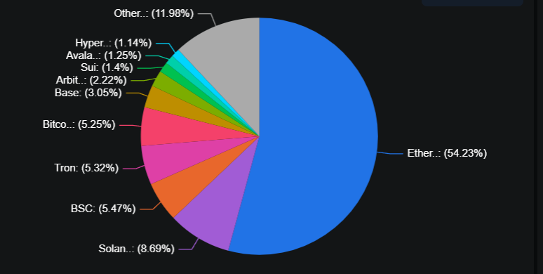 As of May 2025, it has over $11 billion in total value locked (TVL), which reflects all crypto deposited on Solana DeFi apps. Therefore, Solana accounts for nearly 9% of the total liquidity in DeFi, while Ethereum still dominates at 54%.