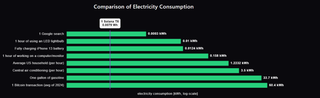 Solana’s PoS algorithm helps it remain energy-efficient compared to Bitcoin’s proof-of-work (PoW), as it doesn’t require extensive computational resources. In fact, each Solana transaction consumes less energy than a Google search.