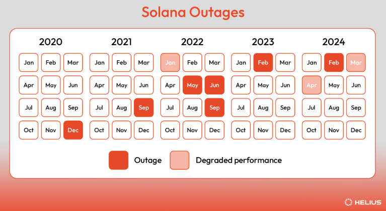Over the past five years, the network has experienced seven outage incidents, five of which were caused by client bugs and two by increased transaction spam.