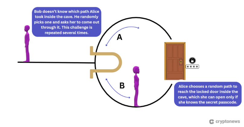 Another classic illustration is the Ali Baba cave analogy. Imagine a ring-shaped cave with a single entry and a locked door on the opposite side. Alice claims to know the door’s password but doesn’t want to reveal it. To prove this, she enters the cave through one path – left or right. Meanwhile, Bob (the verifier) stands outside and randomly asks Alice to exit through a specific path.