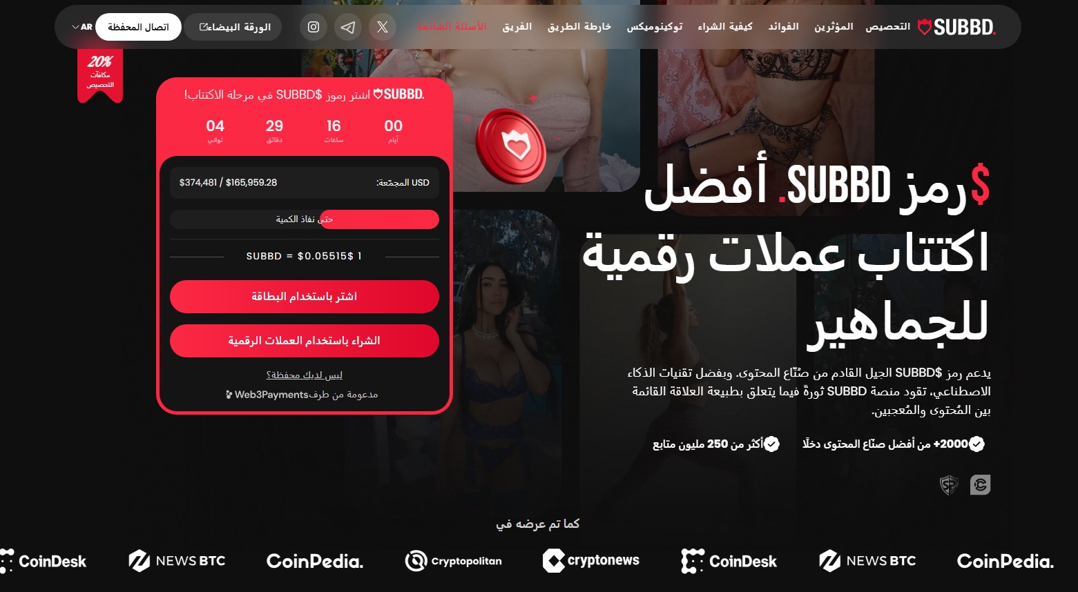 SUBBD هو مشروع عملة مشفرة في مرحلة البيع المسبق (Presale) يعتمد على الذكاء الاصطناعي لطرح منصة للمشهورين وصناع المحتوى الرقمي على الانترنت. تقوم المنصة بربط المبدعين والمعجبين بشكل مباشر باستخدام تكنولوجيا Web3 المتطورة. المهمة الأساسية لمنصة SUBBD هي تزويد المستخدمين بأدوات متقدمة تعمل بالذكاء الاصطناعي، بالإضافة إلى توفير طرق جديدة للتفاعل مع جمهورهم.أبرز هذه الأدوات هي لإنشاء المحتوى، تحرير الفيديو، المدفوعات من خلال العملات المشفرة والعملات الورقية.