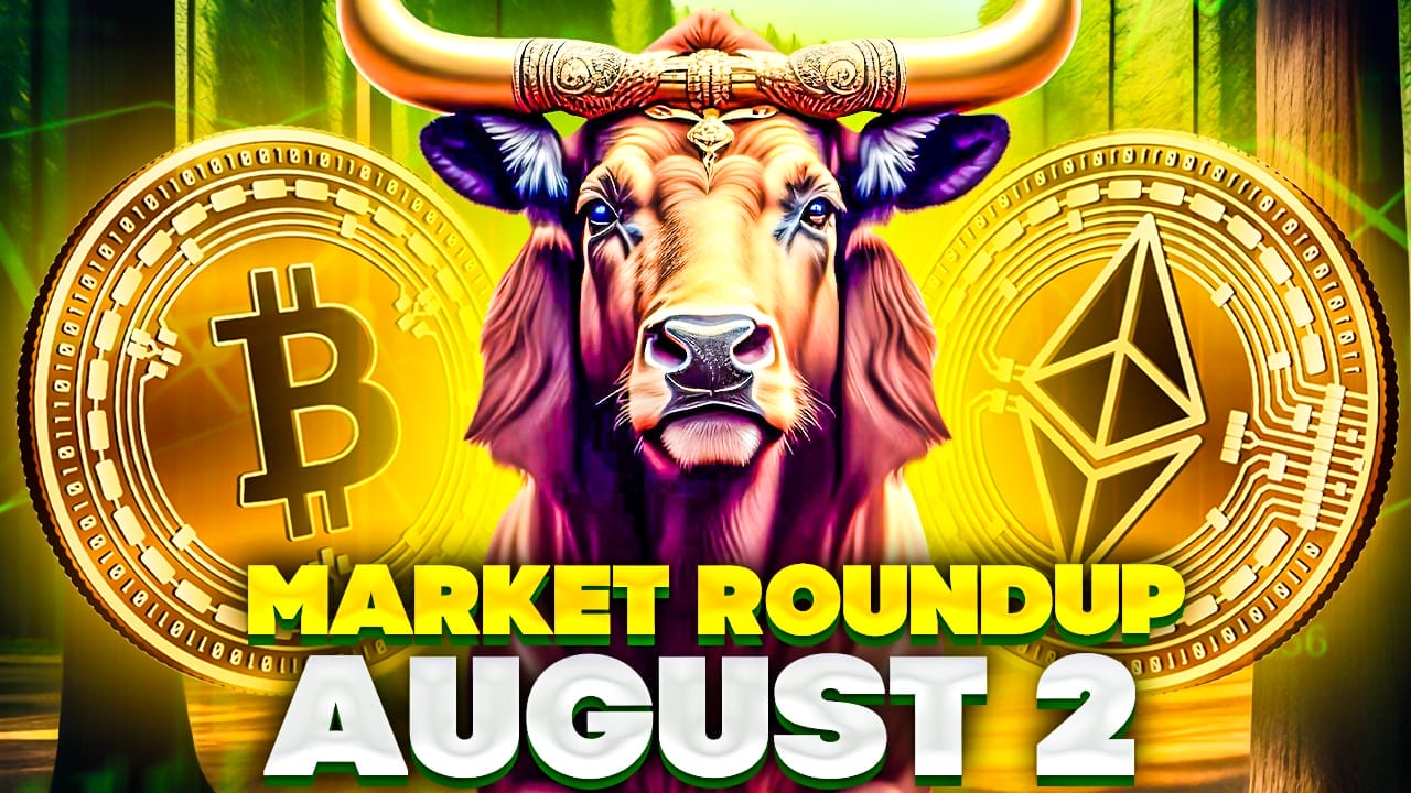 رأس ثور يتوسط شعاري بيتكوين وإيثيريوم وفي الأسفل عبارة تحديث السوق بتاريخ 2 آب/أغسطس