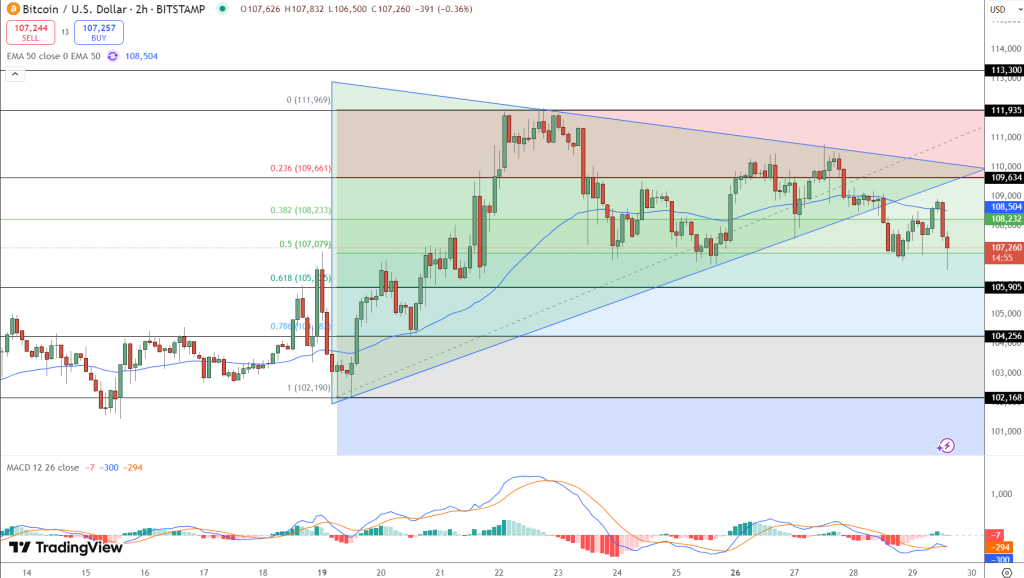 من منظور التحليل الفني للمخطط البياني في إطار الساعتين، تبعث توقعات سعر بيتكوين حالياً إشاراتٍ متضاربة، إذ شكلت تحركاته الأخيرة نمط الراية الفني نظراً لتأرجح السعر ضمن نظاق يضيق بشكلٍ متزايد تستقر أدناه مستويات تصحيح فيبوناتشي، فقد عانى السعر وأخفق في التماسك أعلى مستوى 109,661$ الموافق لمستوى التصحيح 0.236، لتتحوَّل أشرطة مؤشر MACD إلى اللون الأحمر ويهوي السعر إلى ما دون أقرب حواجز المقاومة، والمتمثل بخط متوسط الحركة الأسي بمدى 50 فترة تداول (EMA-50) عند 108,504$.