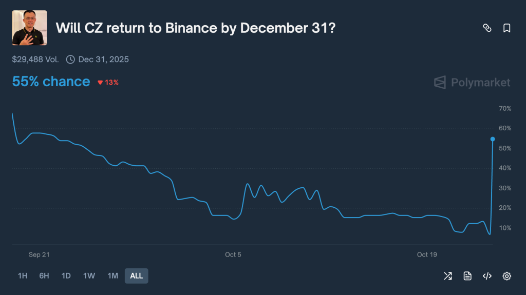 وبحسب منصة بوليماركت (Polymarket) للمراهنات، بلغت فرص حصول CZ على عفو رئاسي 100% قبل صدوره، بينما أظهرت أسواق التوقعات ازدياد فرص عودته إلى شركة بينانس (Binance) قبل 31 ديسمبر من 7% إلى 55% خلال دقائق معدودة بعد الإعلان.
