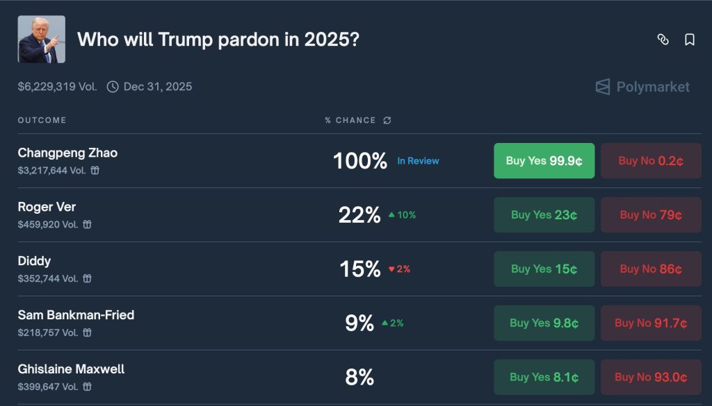 ومن بين الأسماء الأخرى المطروحة لنيل العفو -وفقاً لمنصة بوليماركت- روجر فير (Roger Ver)، وتبلغ فرصته 17%، بينما يبقى CZ المساهم الأكبر في بينانس (Binance) بحصة 90%، وبثروة صافية تُقدّر بـ 75 مليار دولار.