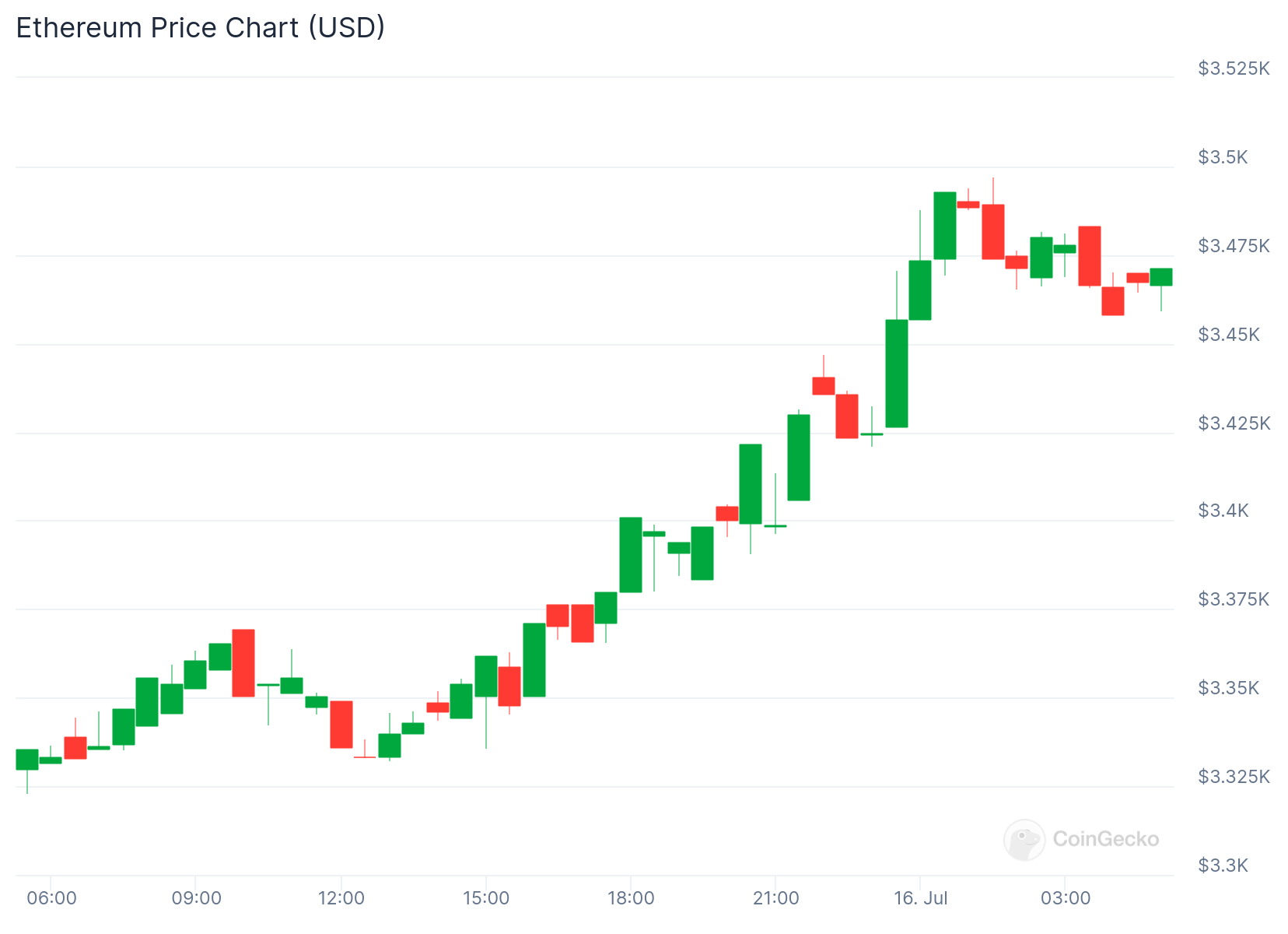 ويتم تداول إيثيريوم حالياً أعلى متوسط الحركة الأسيّ المقاس على مدى 50 يوماً (50 EMA) عند 3,439$، مع قراءة مرتفعةٍ لمؤشر القوة النسبية (RSI) تبلغ 55، ويُعتبر كلاهما علامةً إيجابيةً على زخم صاعد مستمرّ.
