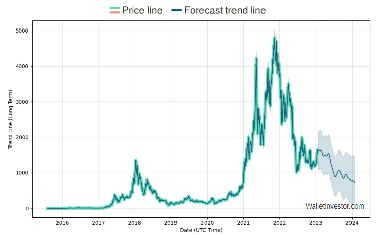 وفقاً لموقع التنبُّؤ بأسعارِ العملات الرقميّة التي تعملُ بشكلٍ مُؤتمَتٍ Wallet Investor، ومن المُرجَّح أن يتمَّ تداولُ عملة إيثيريوم عند مستوياتٍ سعريّةٍ فوق 700$ لمرَّةٍ واحدة خلال مدًى زمنيٍّ طولُهُ عامٌ واحد، ما يعتبرُ انخفاضاً بنسبةِ 55% مقارنةً بالمستويات الحالية.