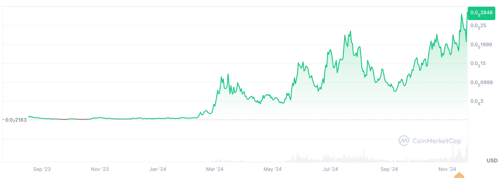 ويُمكنكم فهم الوضع بشكلٍ أفضلَ عند مُقارنة كل ذلك بأداء عملة Mog Coin التي لم تشهد أي حركاتٍ سعريةٍ تُذكر لعدة أشهر بعد إطلاقها، كما هو موضح في المخطط أدناه من CoinMarketCap: