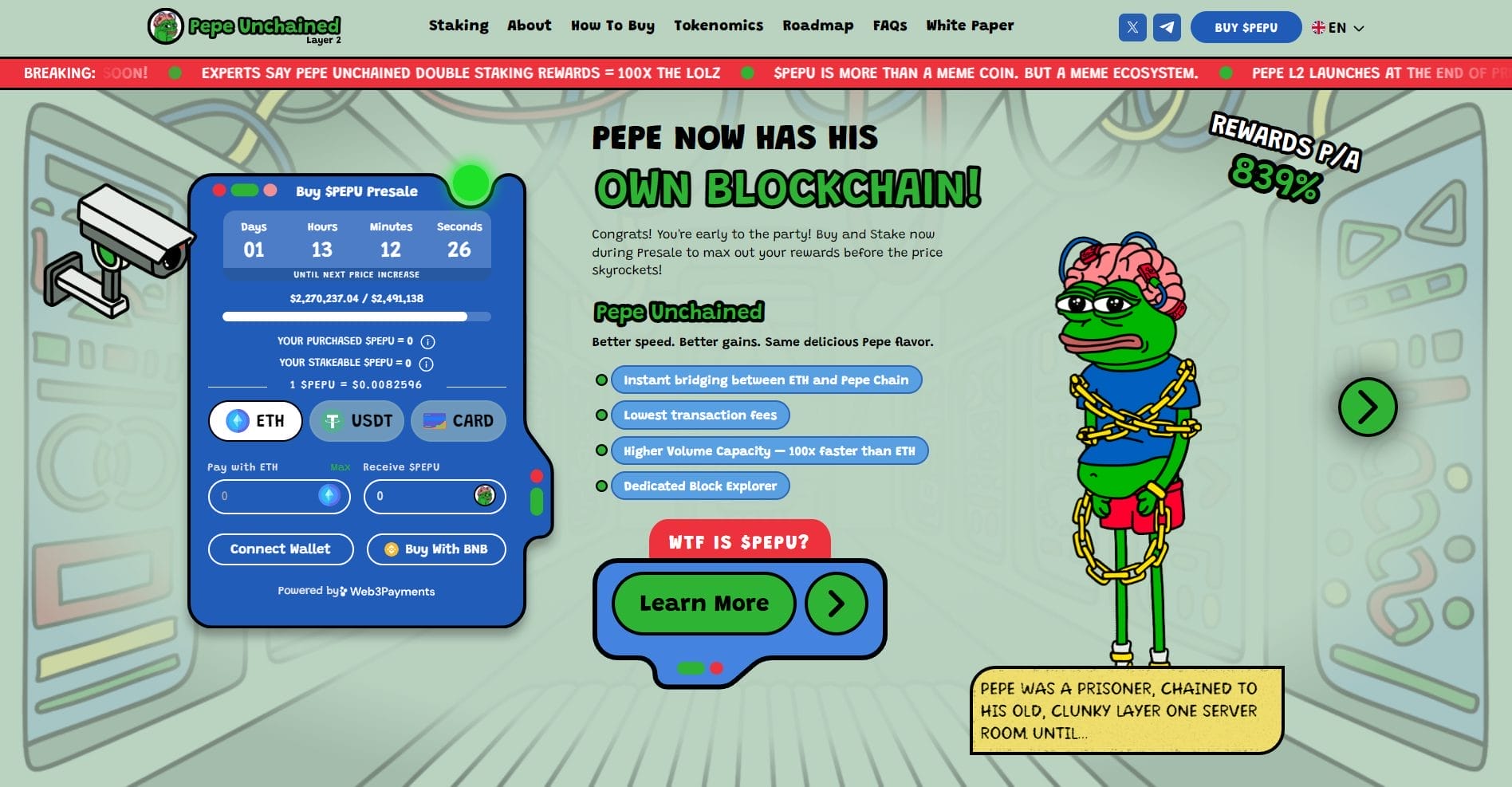يَعِد بلوكتشين حل الطبقة الثانية الخاص بمشروع Pepe Unchained بمعالجة المعاملات بشكلٍ أسرع وبتكلفةٍ أقل، وهما من أكبر نقاط الضعف التي يعاني منها قطاع الكريبتو حالياً.