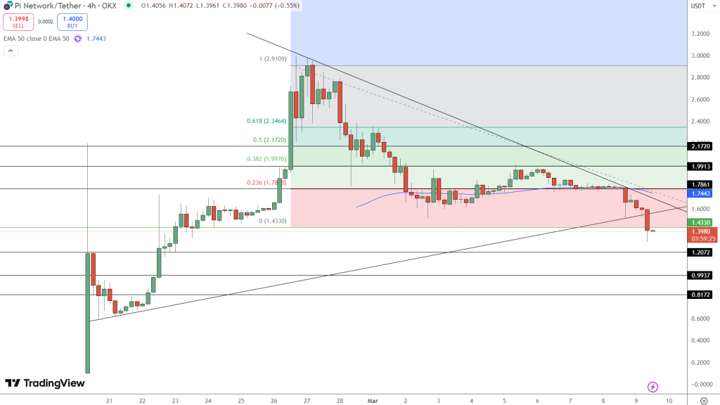 يُظهر سعر عملة Pi Network (PI) علاماتٍ على استمرار الاتجاه الهابط بعد كسره مستوى الدعم الهام عند 1.43$، وتؤكد هذا الحركة كسرَ نموذج المثلث المتناظر، ما يدعم التوقعات السلبية.