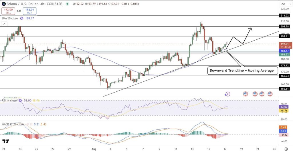 تبدو توقعات سعر عملة سولانا (Solana) إيجابية مع ارتفاعه فوق مستوى 190$، وبقائه فوق متوسط الحركة البسيط لمدة 50 يوماً (SMA-50) عند 188$، ما يُرجّح تواصل اتجاهه الصاعد. ويشير بقاء السعر فوق خط الاتجاه الصاعد إلى تشكل قيعان أقل انخفاضاً، ويعني ذلك عادةً استدامة الاهتمام الشرائي.