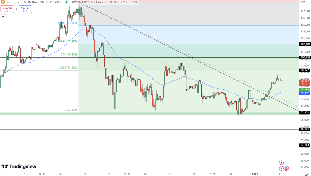 يتم تداول بيتكوين حالياً عند 96,568$ بزيادة نسبتها 3.16% في آخر 24 ساعة وقيمة سوقية تبلغ 1.91 تريليون دولار وحجم تداولٍ يبلغ 33.9 مليار دولار ما يشير إلى اهتمام قوي من قبل المستثمرين؛ لا سيّما بعد ارتفاع السعر فوق خط الاتجاه الهابط، لينحو صوبَ مستوى تصحيح فيبوناتشي 38.2% عند 98,322$ الذي يُمثل مستوى المقاومة الأقرب.