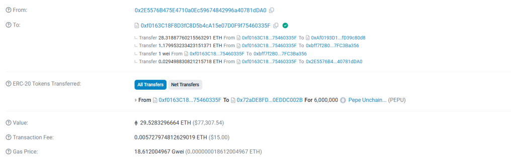 كما ذكرنا سابقاً، فقد ساهمت عملية شراءٍ كبيرةٌ أخرى قام بها أحد الحيتان بوصول حصيلة الاكتتاب إلى 25 مليون دولار. فقد اشترى أحد حيتان الكريبتو 2.2 مليون عملة PEPU مقابل حوالي 27,000$ في وقتٍ سابقٍ من هذا الشهر، ثم قام حوتٌ آخرُ بإثارة ضجةٍ أكبر يوم أمس الخميس بشراء 6 مليون عملة PEPU لقاء ما يقارب 77,000$.