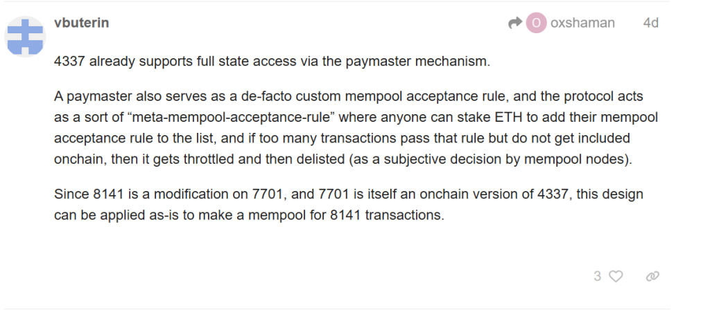 نشر بوتيرين هذا التعليق في سلسلة معاملات الإطار للعناوين الرئيسية، رابطاً بشكل صريح تصميم الإطار بالنموذج الذهني الحالي لـ الدافع في ERC-4337 + قاعدة مسبح الذاكرة الذي تديره فرق البنية التحتية بالفعل في الإنتاج.