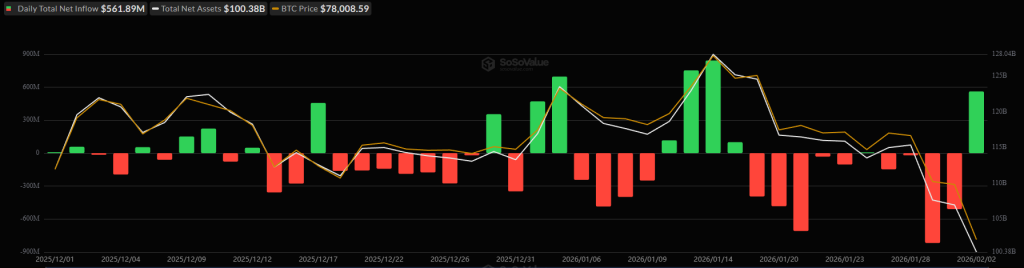 بعد أربعة أيام من التدفقات الخارجة، أغلقت سندات متداولة في البورصة الفورية لبيتكوين في الولايات المتحدة جلسة يوم الاثنين بتدفقات داخلة إيجابية بقيمة 561.89 مليون دولار. وبذلك، تمكن إجمالي التدفقات الصافية من البقاء فوق 55 مليار دولار، حيث ارتفع إلى 55.57 مليار دولار.