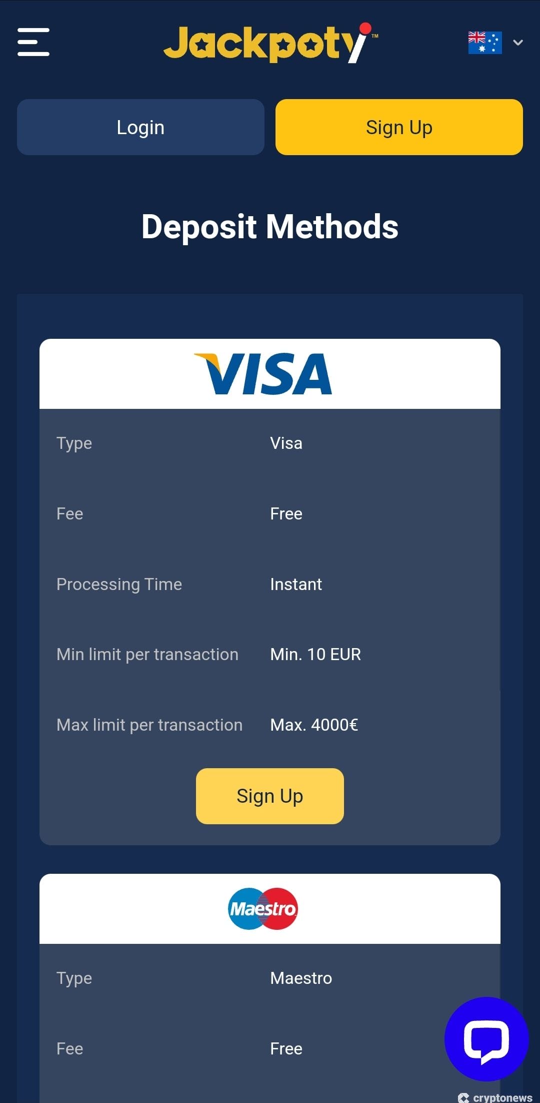 - Deposit with 8 cryptos, Apple/Google Pay, or via Visa/Mastercard