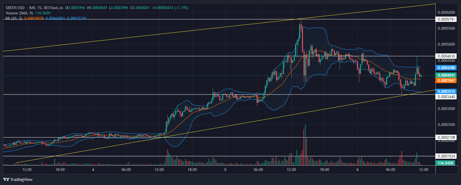 Isso ocorre em meio a uma correção de preço de -30%, que fez com que o preço do BEER recuasse de uma nova alta histórica de US$ 0,00057 para se consolidar acima do suporte menor em US$ 0,00034.