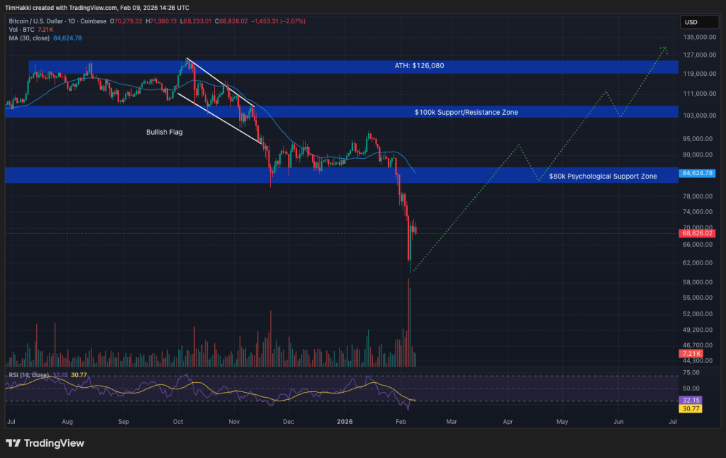 O Bitcoin ($BTC), a maior criptomoeda do mundo, caiu cerca de 45% em relação ao seu ATH de US$ 126.080, estabelecido em 6 de outubro de 2025, e agora é negociado ao seu preço mais baixo desde novembro de 2024: cerca de US$ 69.200.