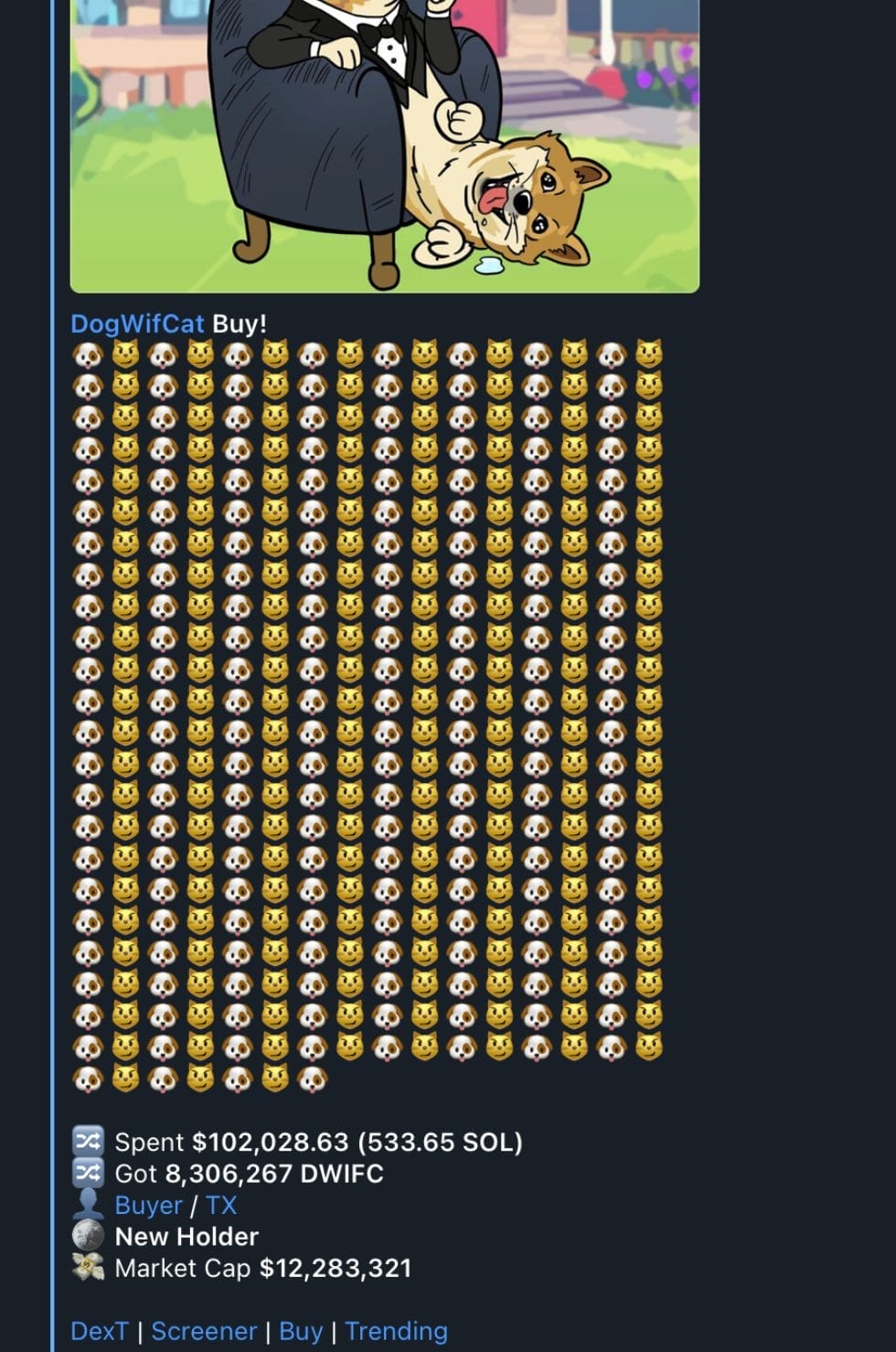 Um desses grandes investidores entrou pesado com uma compra de US$ 102.000 – como mostrado no screenshot abaixo, retirado do canal do Telegram do DogWifCat: