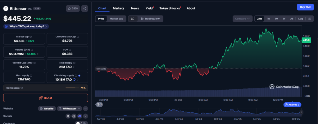 A quarta criptomoeda com potencial de destaque em novembro é a Bittensor (TAO), um projeto que une inteligência artificial e blockchain.