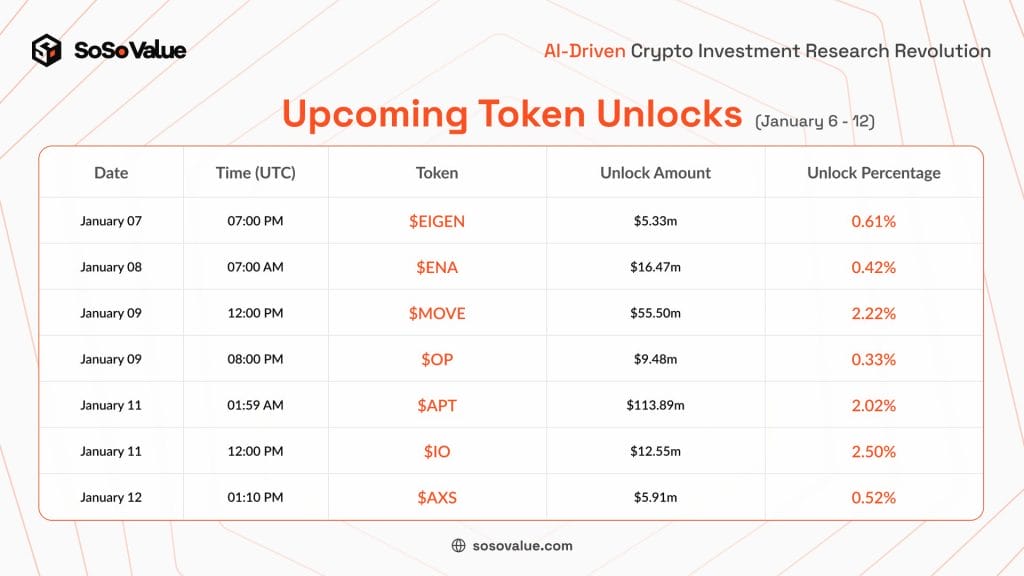 Nesta terça (07/01), a EIGEN liberará US$ 5,33 milhões em tokens, representando 0,61% de sua oferta total. Assim, a criptomoeda, focada em soluções de validação descentralizada, pode enfrentar pressão vendedora significativa.