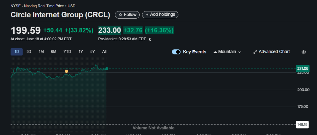 De acordo com dados do TradingView, no mesmo dia da votação, as ações da Circle (CRCL) subiram de US$ 145 para US$ 199,59.