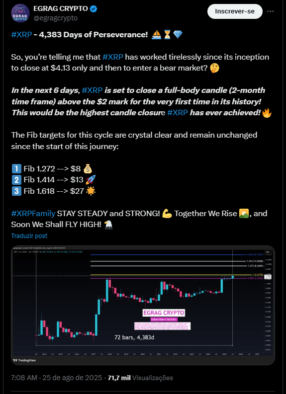 O analista EGRAG CRYPTO corrobora parte dessa visão ao afirmar que o XRP está prestes a registrar o maior fechamento de vela em sua história no gráfico de dois meses.