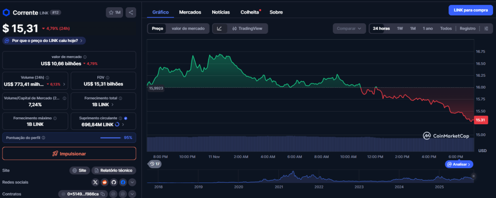 O LINK, porém, enfrenta desafios técnicos. O preço rompeu o suporte de US$ 15,50, e analistas acreditam que a recuperação desse nível é essencial para evitar novas quedas.
