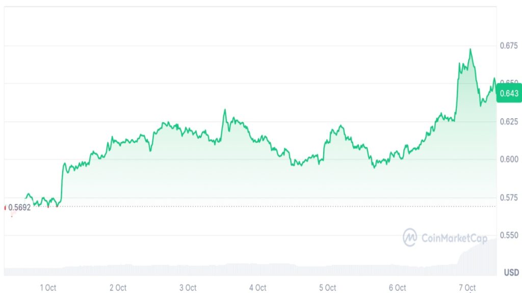A criptomoeda Stacks é negociada em torno de US$ 0,65, com alta de 6,5% nas últimas 24 horas.