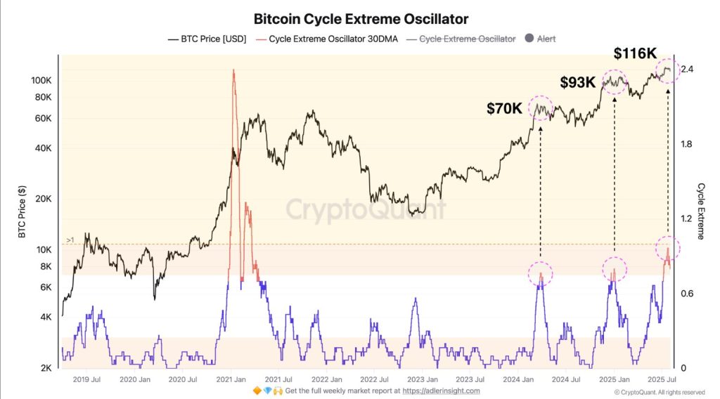 O Oscilador Extremo de Ciclo, que avalia desvios de métricas como NUPL e MVRV, registrou um pico no início de julho, com alerta de superaquecimento.