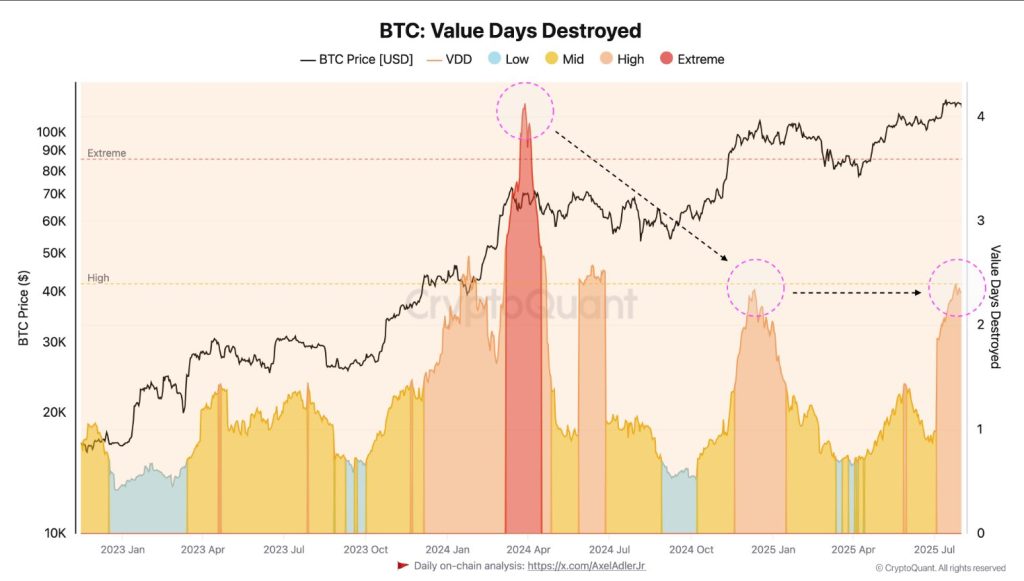 Ele atingiu a zona alta no fim de julho, revelando um movimento de realização de lucros por holders de longo prazo, mas sem provocar uma queda acentuada.