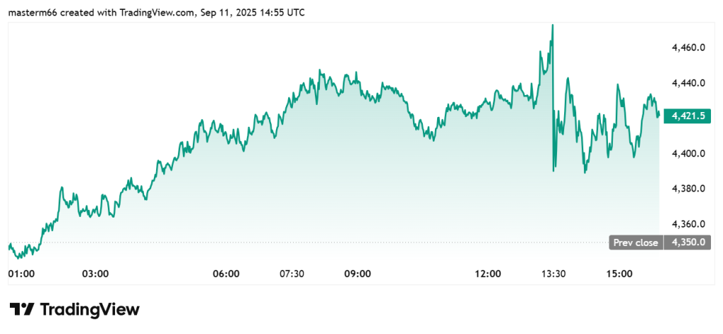 O preço do ETH reagiu rapidamente. Nas últimas 24 horas, avançou 1,68%, chegando a US$ 4.423, segundo dados do TradingView.
